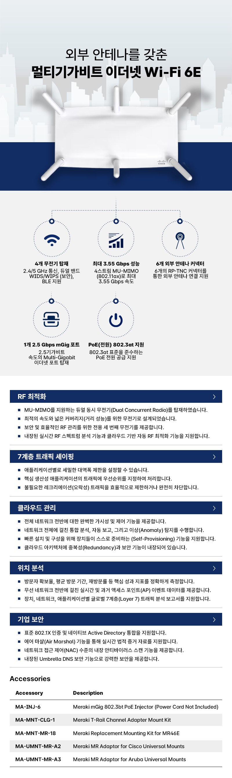 Meraki MR46E Wi-Fi 6 Indoor AP w External Antenna Connectors
